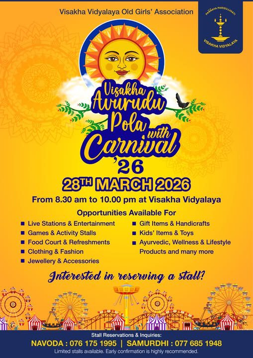 Visakha Avurudu Pola 2026 + Add to Google Calendar + iCal / Outlook export 00 days 00 hours 00 minutes 00 seconds Date Mar 28 2026 Time 8:30 am - 10:00 pm Location Visakha Vidyalaya Category Alumni EventsUpcoming Alumni EventsUpcoming Events Organizer VVOGA Share this event