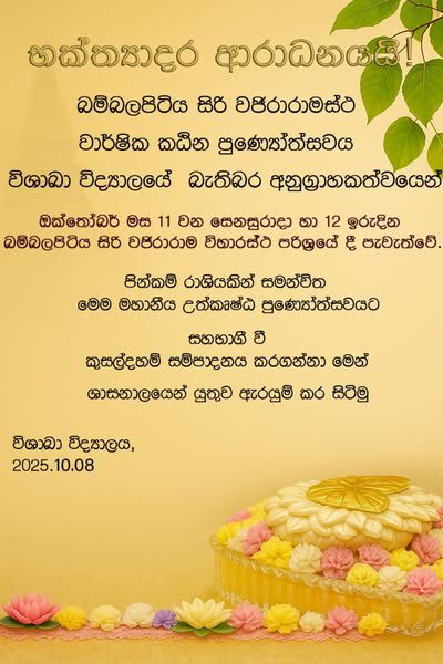 ගුණ නැණින් සුපෝෂිත සුහුරු විශාඛාවන් නව ලොව අභියෝග ජයගෙන හෙට ලොව දිනන ගමනේ හෙළ බොදු කතකගේ අතීත වත් සිරිත් අර්ථාන්විතව නව පරපුරටද දායාද කරනු වස් සිදු කරනු ලබන අසිරිමත් කඨින මහ පින්කමට සමගාමීව පවත්වනු ලබන පින්කම් මාලාවේ සම්බුද්ධ පූජාව හා චීවරය දැක බලා වැඳ පුදා ගැනීමට දියණියන්ට අවස්ථා සලසා ඇති මෙම දින කිහිපයේ, ආදරණීය දියණියන්ගේ දෙමාපියන්ට ද පාසැල් දින වලදි පස්වරු 1.30 පසු ප.ව 7.00 දක්වා ද,