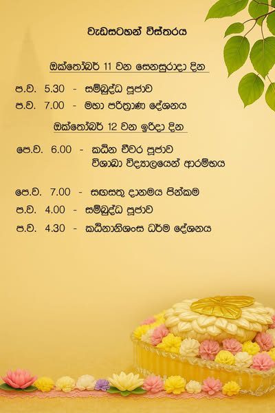 සෙනසුරාදා උදෑසන 7.00 න් පසු දවස පුරා ද පැමිණ සහභාගි විය හැකි බැවින් ඒ සඳහා එකතුවන ලෙස බැතිබර සිතින් යුතුව ආරාධනා කර සිටින්නෙමු.